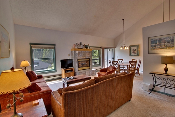 This sunny third floor 2 Bedroom plus loft unit features vaulted ceilings, an open floor plan, and a beautiful woods view. The gourmet kitchen is totally stocked with everything you will need to make and serve your favorite dishes. Also there are two bar stools and a six person dining room table. The unit also includes a cozy living area with two oversized couches and a 32” flat screen TV.  This unit also contains large bedrooms with closets and dressers for storage, as well as an armoire in the loft for storing your clothes.