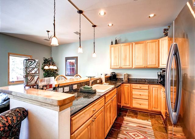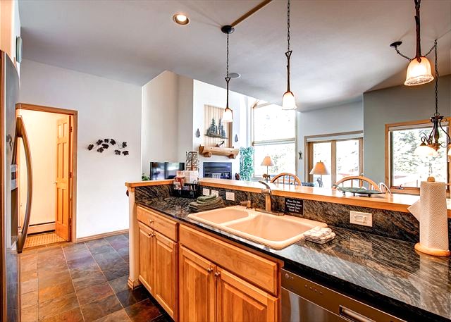 A fully equipped kitchen with maple cabinetry is separated from the dining/living area by a breakfast bar with three bar stools. Green granite kitchen counters complement the kitchen and dining room. Country style birch dining table seats 8. A 1/2 bath is located in the hall off the kitchen. Off the kitchen dining area is a large deck with patio furniture, gas BBQ grill and great views of the Four O'Clock ski run.