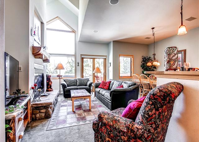 The living room has a 2-story, vaulted ceiling with cathedral windows offering views of Four O'Clock ski run. Here, a gas-fired fireplace is faced with New Delhi slate. Adjacent to the fireplace is a built-in entertainment center which houses the TV/VCR and stereo CD player. A music library and video cassette library is provided along with reading materials and games. A contemporary sofa and lounge chair face the fireplace.