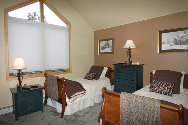 Heading upstairs, there are two more bedrooms. First, the spacious Master suite has a King aspen bed and a flat screen TV, along with two cathedral style windows that will let in tons of that mountain sunshine! The Master bathroom is also spacious with his and hers sinks, a jacuzzi tub and separate shower. The third bedroom, just down the hall has two Twin aspen beds and another TV for those of you who enjoy a show before calling it quits for the night. The bathroom for the Twin bedroom is just out the door and also has a combination shower and bathtub.
