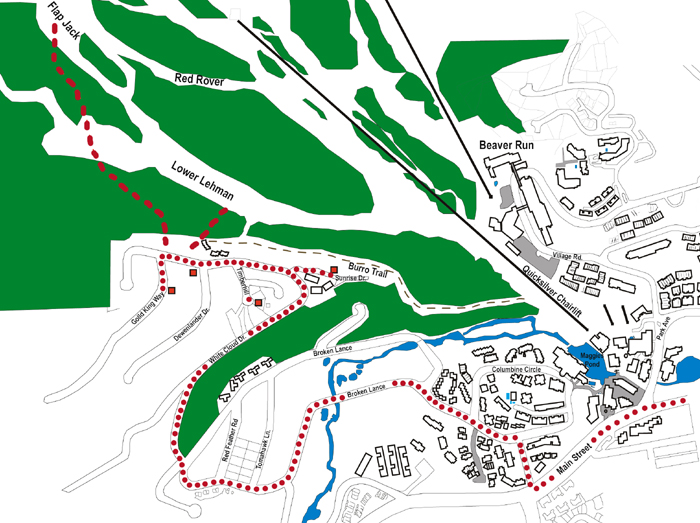 Timberhill house is located only a couple hundred yards from the Lower Lehman Ski Run on Peak 10. From Main Street turn RIGHT on Broken Lance Drive (West) at the stop light by the Conoco. At the T- in the road (one block) turn LEFT at the Stop sign. You are still on Broken Lance. Go past Columbine and past Tomahawk Lane and finally Red Feather Lane. At the next stop sign continue UP the ridge on White Cloud Drive. At the top of the ridge White Cloud veers left. The ski slopes and Lower Lehman is on the right. Make your first LEFT onto Timberhill Drive. The home is at the end of the Cul De Sac on the Left #37.