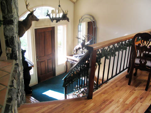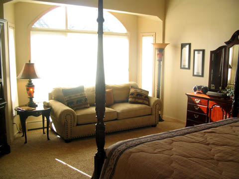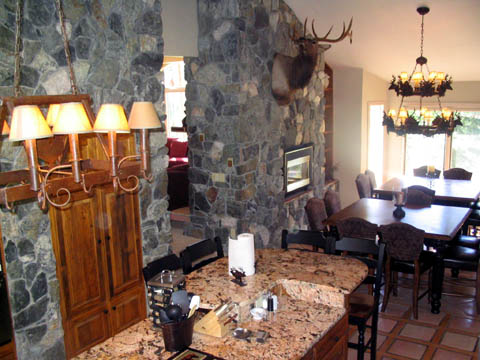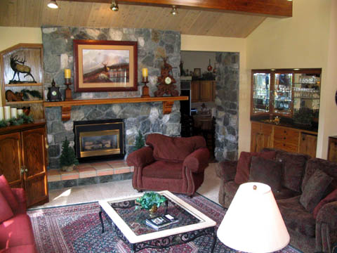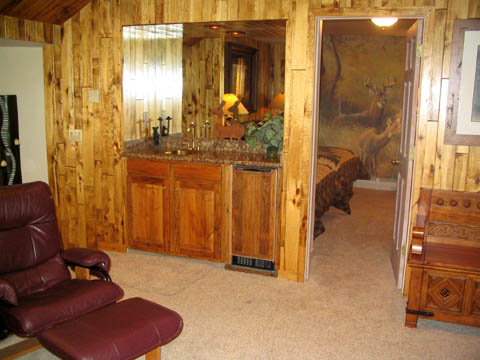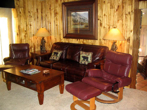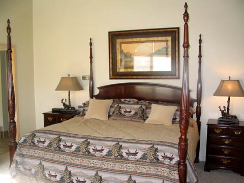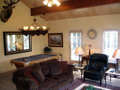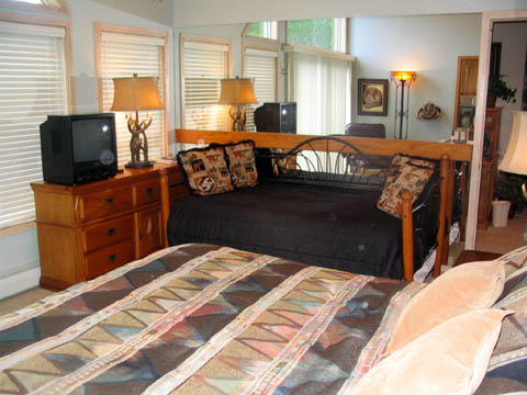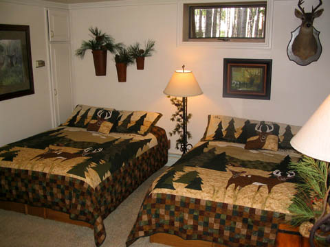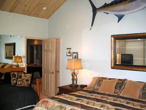 The 2nd bedroom has two queen beds and an adjoining bunk bed room and the den is adjoining. This is on the lower level and there is a nice sitting area and washer and dryer in the lower entryway. The 3rd bedroom is nicely decorated with Ansel Adams artwork and is also located on the lower level with a Queen & Trundle bed along with a private bathroom. has king. The 4th bedroom has a Bunny theme, and has a Queen bed and a faux fireplace.The top floor has another master bedroom with a King & Trundle bed. This bedroom has sliding glass doors that open up to an incredible view and the deck with the hot tub. The room is decorated with a Trophy swordfish caught in Cancun, Mexico. The 6th bedroom has a Queen bed and is decorated with an American Indian theme.